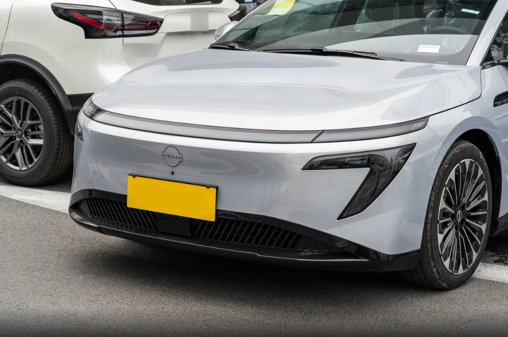 其次就是外观设计方面,整车外观设计非常简洁,没有太多多余的线条,完全符合大家对于新能源车在设计上的印象。日产N7的前脸用了现在电动车超流行的封闭式设计,没有传统的大格栅,看着特别干净利落。大灯是分体式的,上面一条贯穿整个车头的LED灯带,亮起来像道精致的光带,和两侧倒L形的灯组配在一起,白天辨识度就不低,晚上开灯后更是一眼就能从车流里认出来。