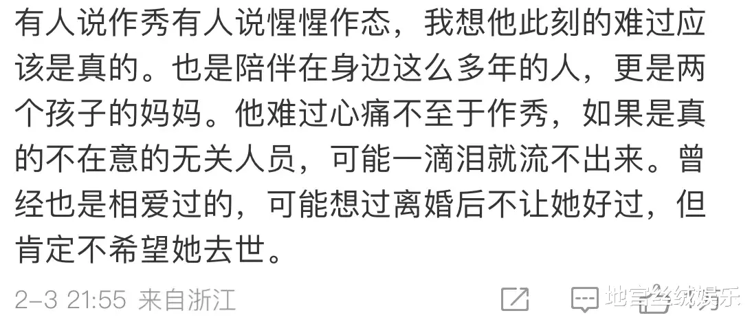 不过,也有网友表示,有人说他不正常,说他惺惺作态,但他此刻的难过应该是真的,毕竟两人十年婚姻,是陪伴了那么多年的亲人,更是两个孩子的母亲。曾经相爱过,离婚后是肉眼可见不想让她过得好,但肯定是不希望她去世的。