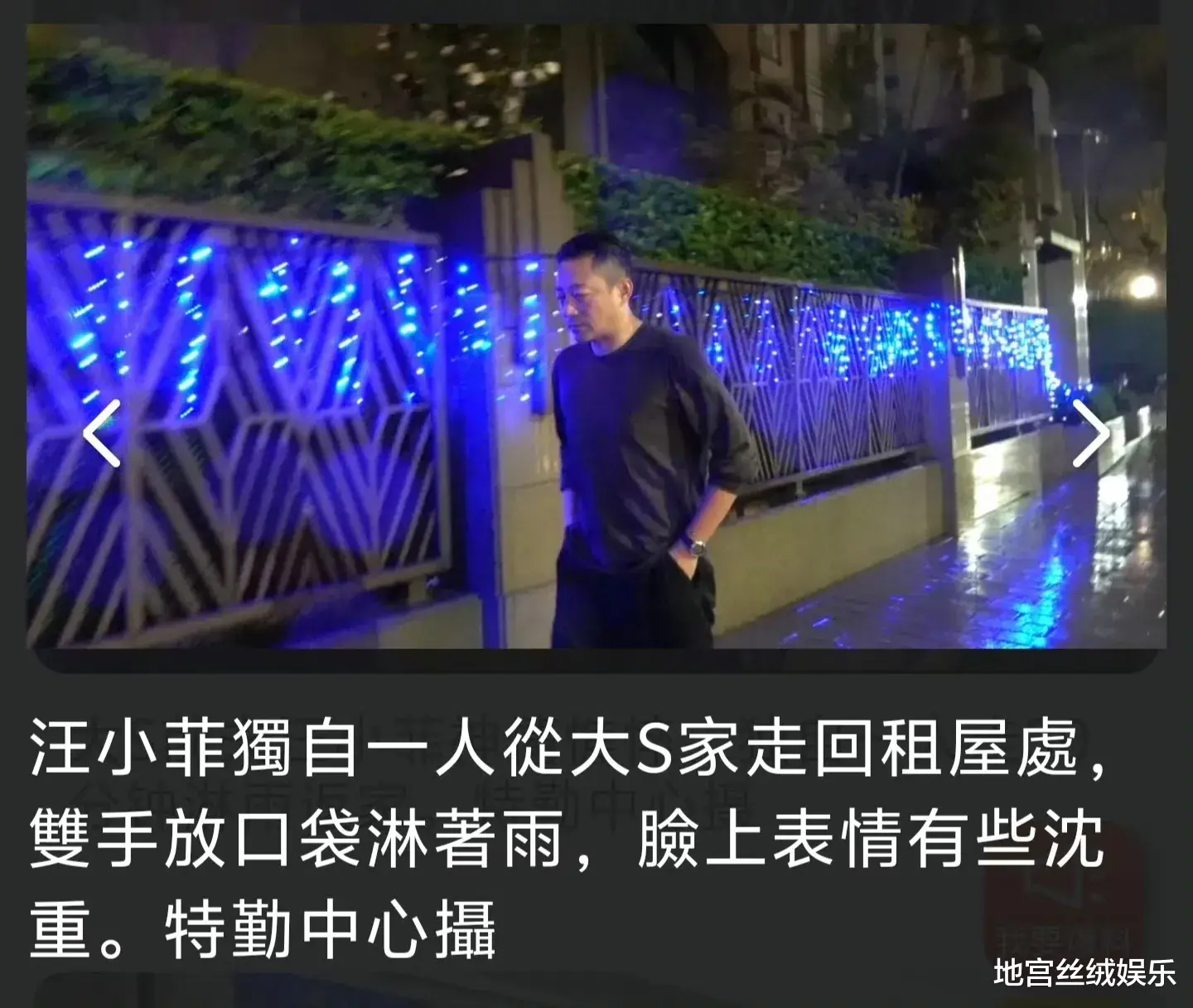 大S的前夫汪小菲昨天就已经从泰国飞到湾湾,昨天晚上更是在台北街头淋着雨前行,没打伞一言不发,面容憔悴看起来刚刚哭过。面对周围记者的各种询问,他没回答一个问题,就这样耷拉着脑袋走进了小区。看他的头发,几乎都被雨水打湿了。