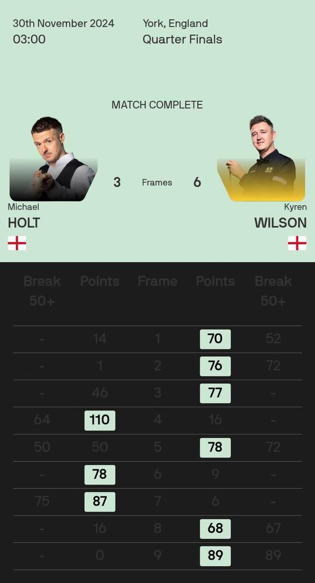 全场比赛凯伦·威尔逊打出52、72、72、67、89分五杆单杆50+,迈克尔·霍尔特打出64、50、75分三杆单杆50+,凯伦·威尔逊一波三连鞭开场,最后以一波两连击,锁定胜利,以6-3力克迈克尔·霍尔特,晋级4强。