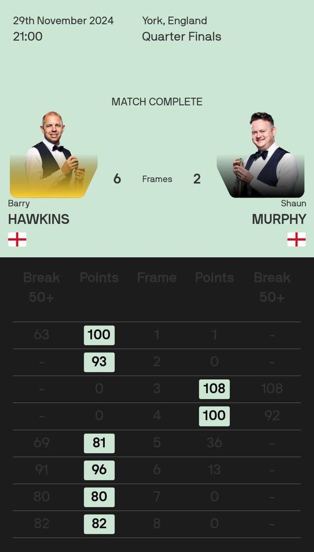 巴里·霍金斯全场打出63、69、91、80、82分五杆单杆50+,肖恩·墨菲打出一杆108分破百和一杆单杆92,霍金斯一波两连击先声夺人,一波四连鞭锁定胜局,以6-2战胜墨菲,晋级四强,兑现了“四强专业户”的担当。
