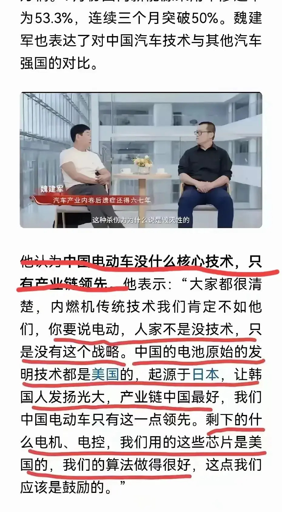 在汽车这个充满激情与速度的行业里,每一次技术的革新和市场的变动都能引起广泛的关注。最近,长城汽车董事长魏建军的一番言论,就像是在平静的湖面上投下了一颗石子,激起了层层涟漪。他公开表示,中国的电动汽车在核心技术上并没有优势,这番直白的言论立刻引发了公众的热议。