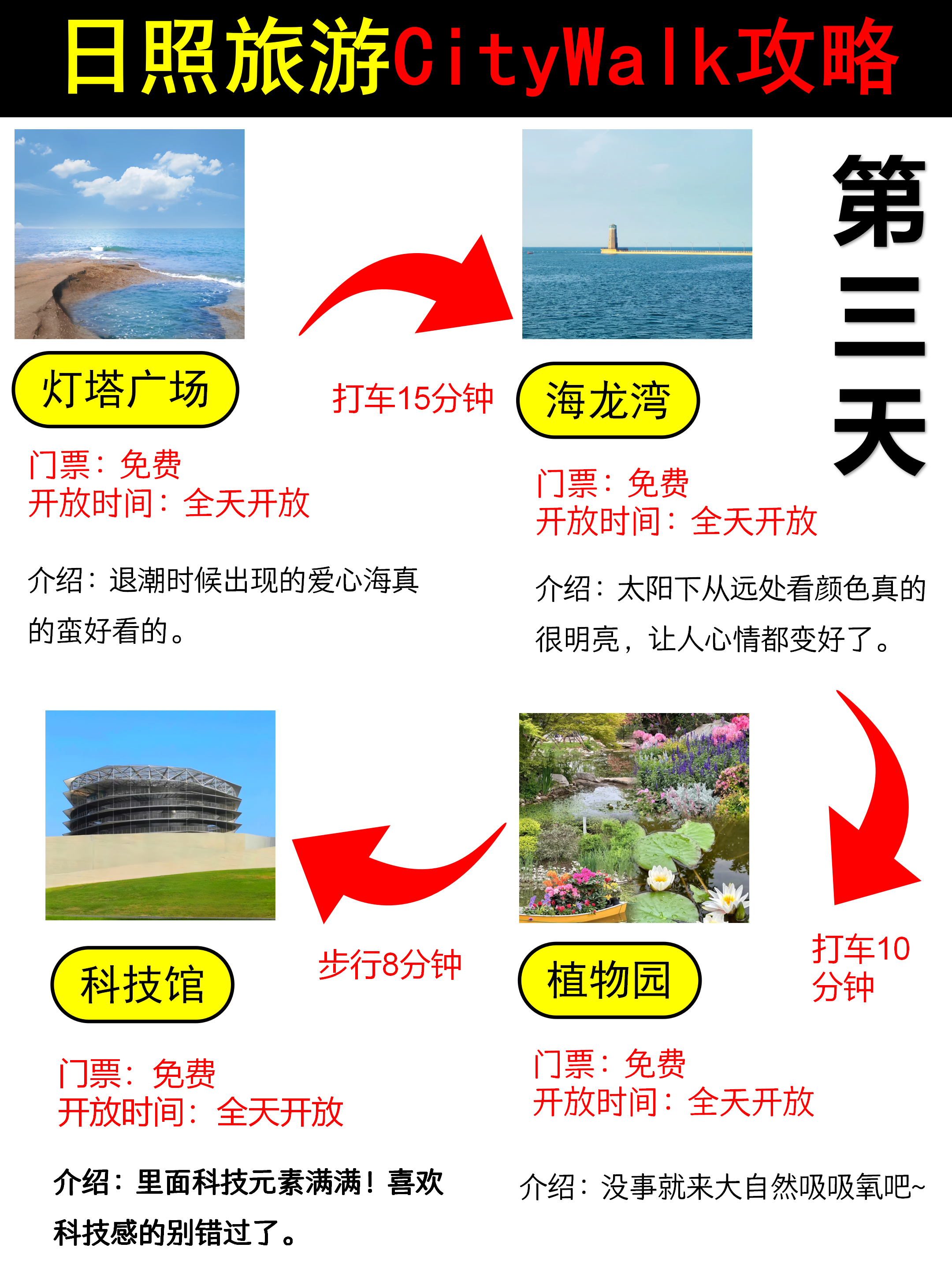 6、日照景点都在一条海岸线上,建议按照我的路线图游玩景点,不走回头路,省时省力。日照出租电动车的很多,建议租电动车出行游玩,沿着海岸线骑行体验感很不错哦。