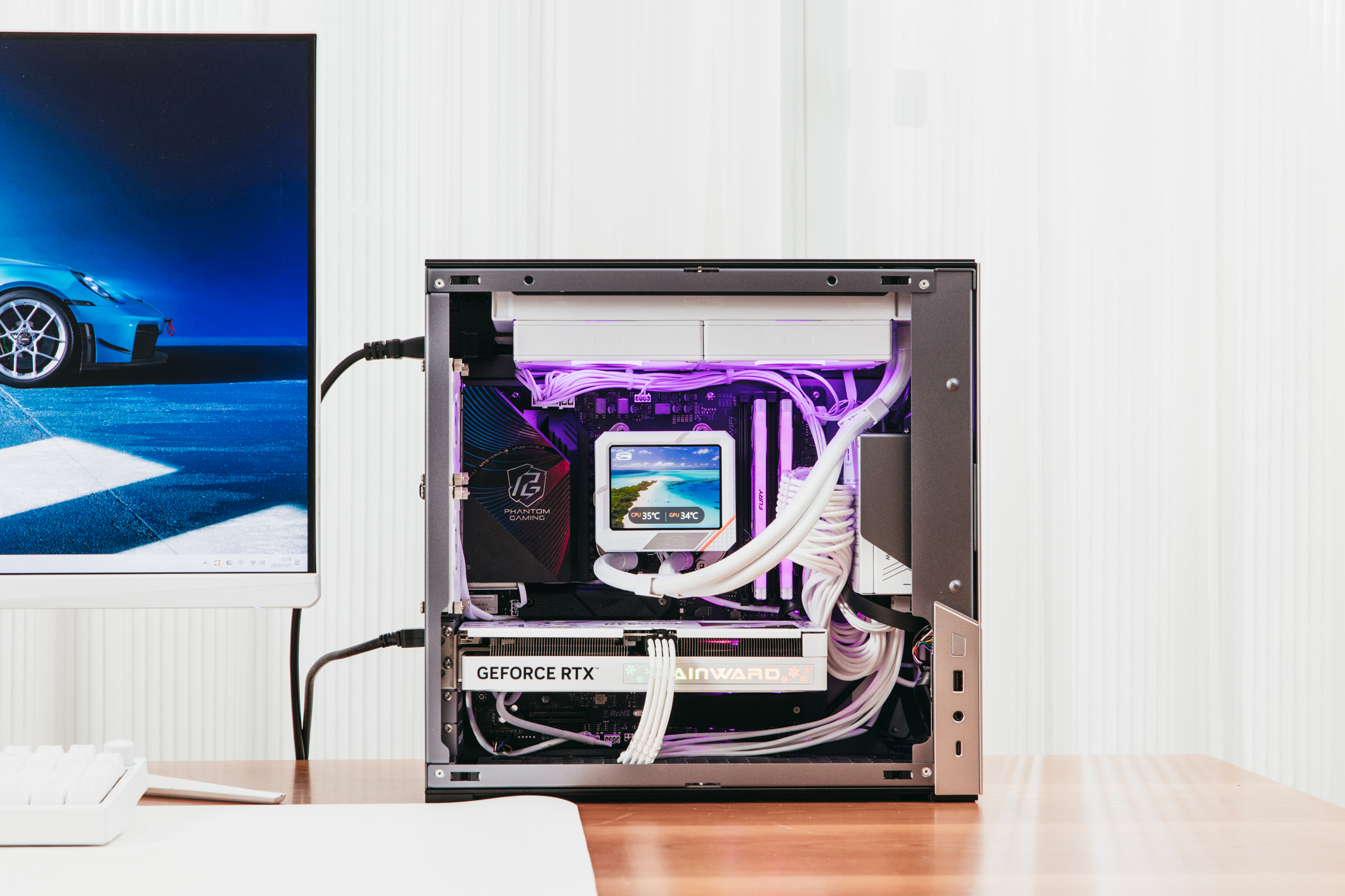 这套主机整体搭建也是相对紧凑,19L的体积塞下了240水冷+MATX主板+双卡槽显卡,另有双8cm风扇加强空气对流。