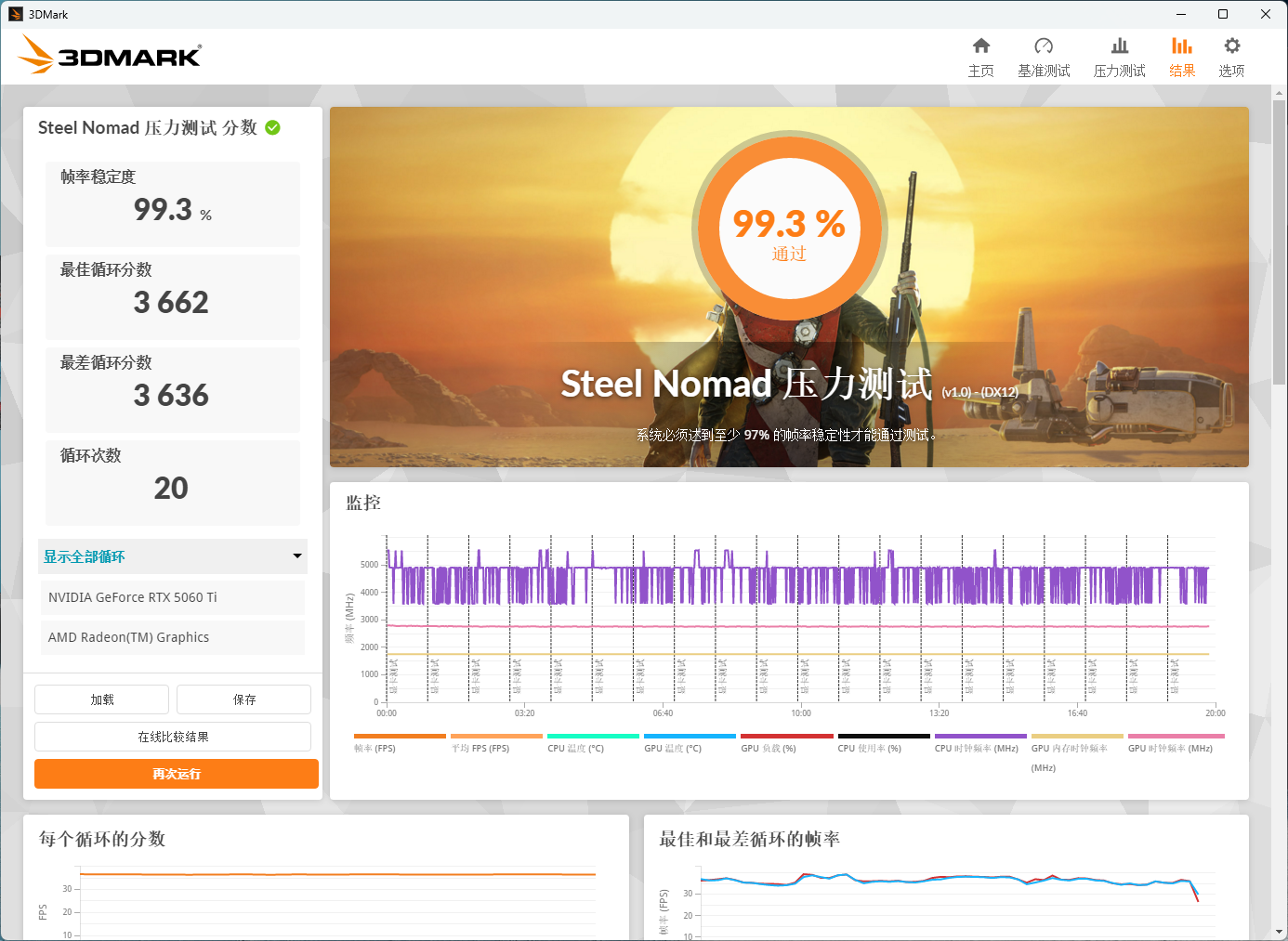 三连压力测试,3D Mark的压力测试表现优秀,Steel Nomad压力帧率测试稳定度99.3%,Fire Strike Ultra压力测试帧率稳定度99.2%,Time Spy Extreme压力测试帧率稳定度99.1%。