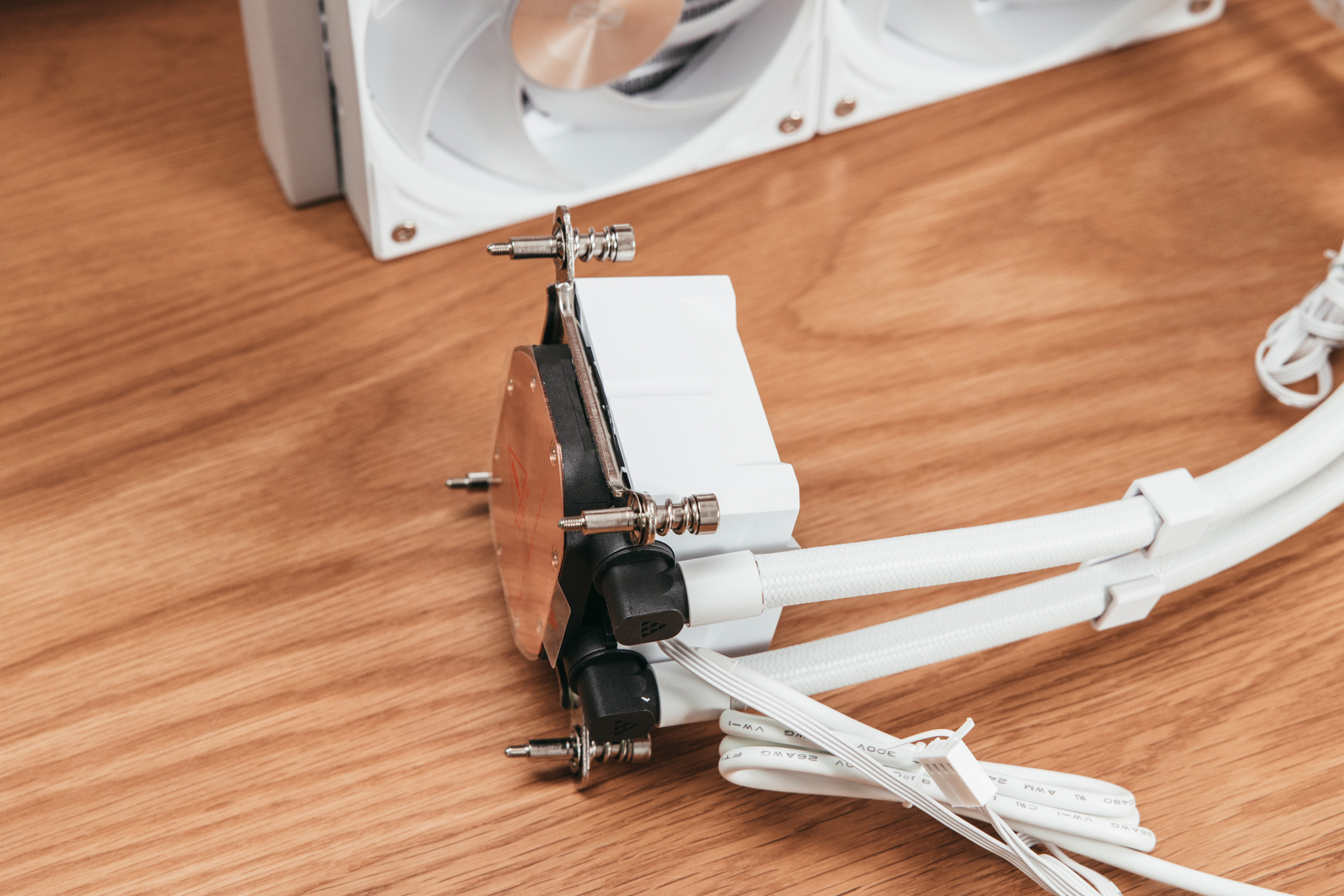 冷头一览,有着大面积铜底座,搭载了全陶瓷轴承水泵,寿命更长。