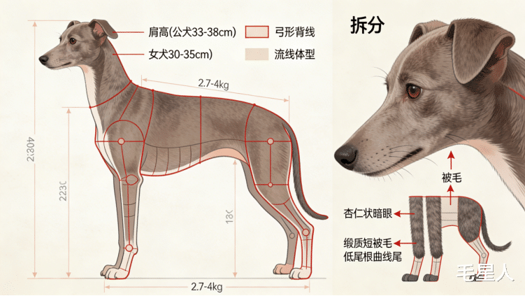 头部呈狭窄的楔形,头颅指数小于50(属长头型),黑色鼻尖小巧尖锐,止部不明显,脑袋几乎呈水平状态。眼距适中的暗褐色杏仁眼明亮聪慧,浅色眼睛则属于品种缺陷;耳朵小而轻薄,非警戒状态时向后折叠贴于头部,立耳或纽扣耳为严重失格特征。颈部长而呈优美拱形,胸部深窄,背线从马肩隆到腰部形成优雅弓形,尾巴细长呈曲线状,尾根位置低,自然垂至飞节,卷尾属严重缺陷。整体外形宛如缩小版灵缇,却更添精致灵动。