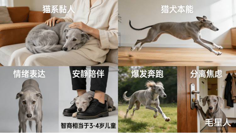 (二)性格特质:猫系犬的“矛盾统一”意大利灰狗的性格堪称“犬界猫精灵”:作为玩具犬,它极度黏人温顺,喜欢蜷卧在主人膝头或沙发上晒太阳,甚至会像猫一样高耸背部表达情绪,部分个体可被训练使用猫厕所,颠覆传统犬类习性。但作为猎犬后裔,它保留着强烈的运动本能,短距离冲刺速度可达每小时40公里,看到飞鸟或野兔会瞬间激发追逐欲,需格外注意户外牵引。