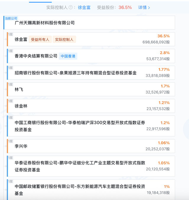 天眼查显示,徐金富持有公司股票6.99亿股,占总股本的36.5%,为公司第一大股东。