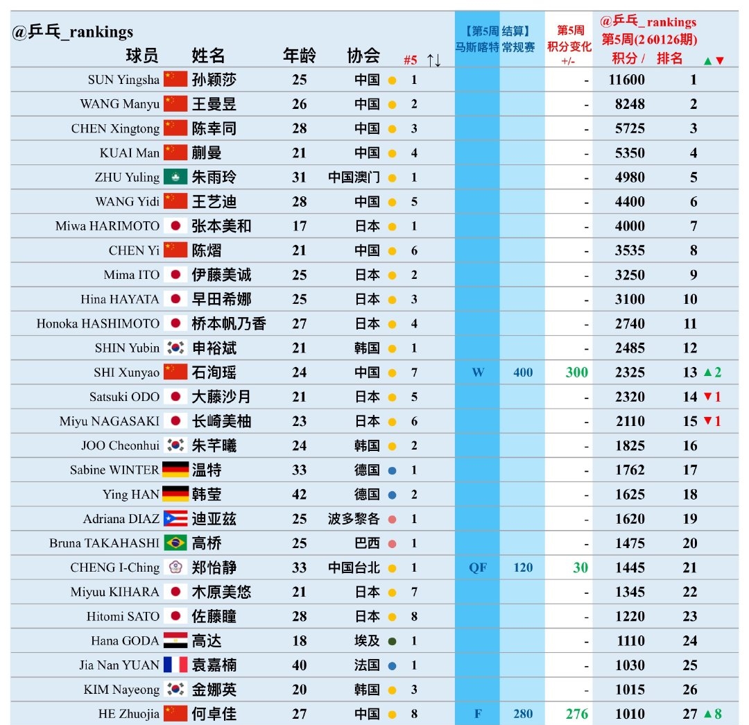 WTT马斯喀特站常规挑战赛的结束,新一期的世界排名又更新了。石洵瑶和何卓佳包揽了这次挑战赛的冠亚军,成为了最大赢家。这次参赛的几个国乒女队选手发挥很出色,都有不同程度的积分上升。石洵瑶在女单半决赛击败了纵歌曼,决赛击败何卓佳,成功夺得了冠军,这也是她隔20个月之后,再次在WTT赛事单打夺冠。