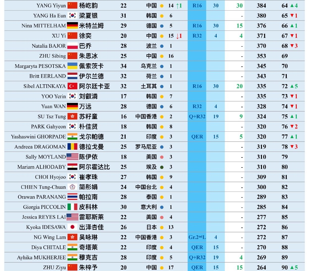 平野美宇排名下滑了一位,来到了第52名。国乒选手范姝涵新增了四个积分,排名下滑了两位来到了第60名。削球手杨屹韵获得了30个积分排名上升了四位,目前世界排名64名。徐奕增加了四个积分,排名下滑一位,来到第67名。土耳其选手阿尔廷卡亚上升了五个名次,增加了20个积分,世界排名第72位。