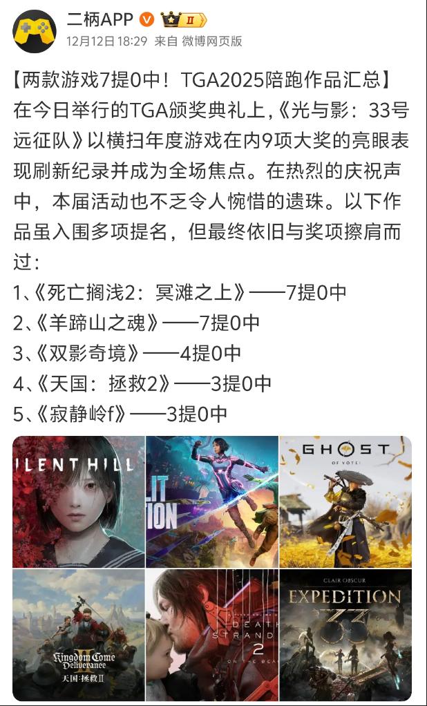 比如最佳叙事的奖项,入围还有《死亡搁浅 2:冥滩之上》、《羊蹄山之魂》、《天国:拯救 2》、《寂静岭 f》,这几个游戏的竞争力并不弱。