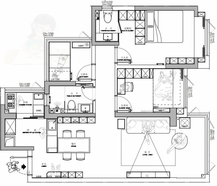 主卧床头与房门之间,加入一个衣柜作为隔断,满足收纳的同时,还避免了床头对卫生间,又增加了主卧的安静隔音效果。