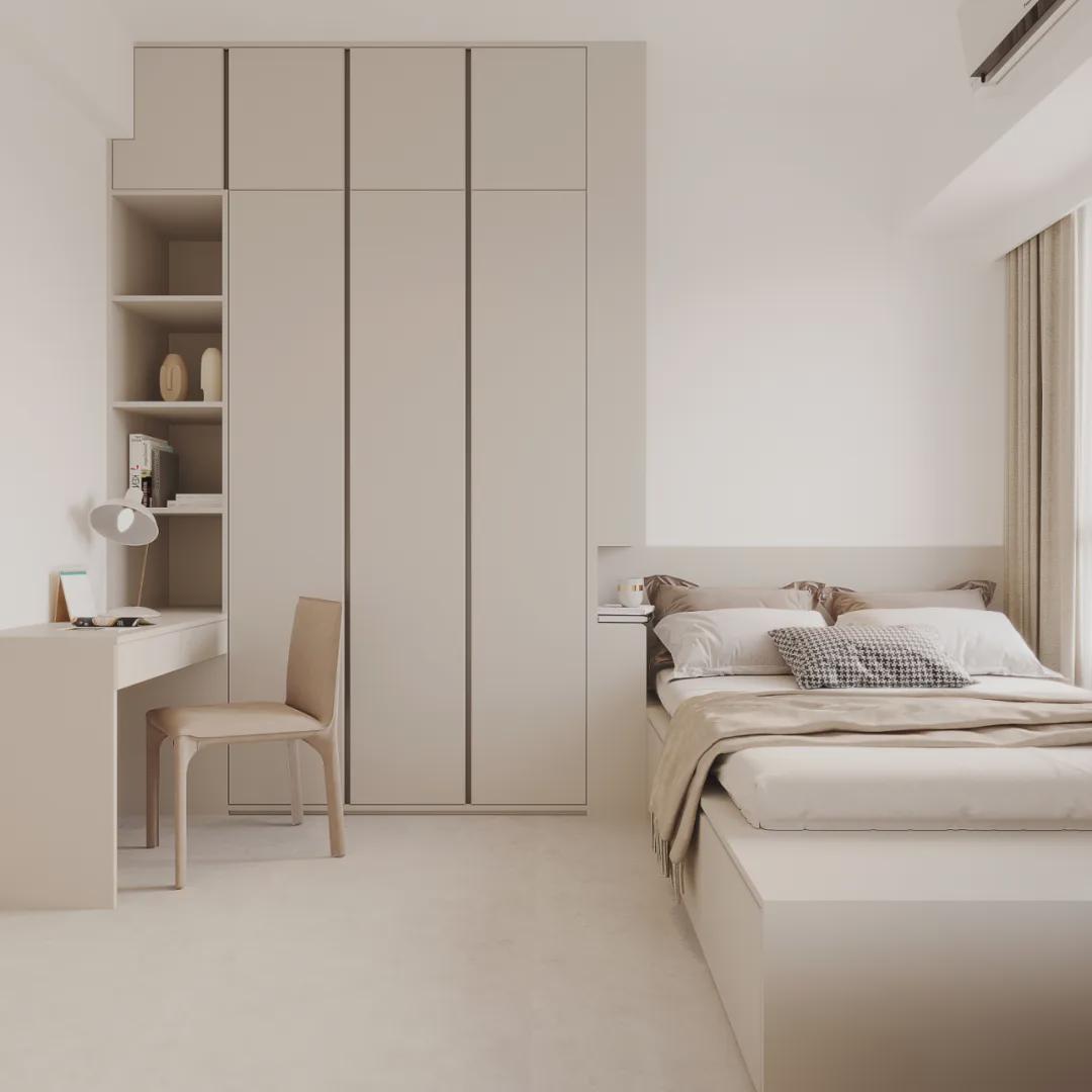 父母房靠窗定制床铺,床头旁边是连体的衣柜+书桌,整体空间连贯性极强。