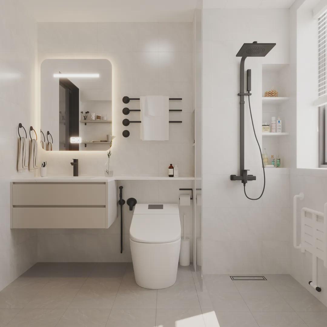 马桶后的小台面与毛巾架,加上带灯带的洗漱镜,洗漱化妆也能照亮你的美。