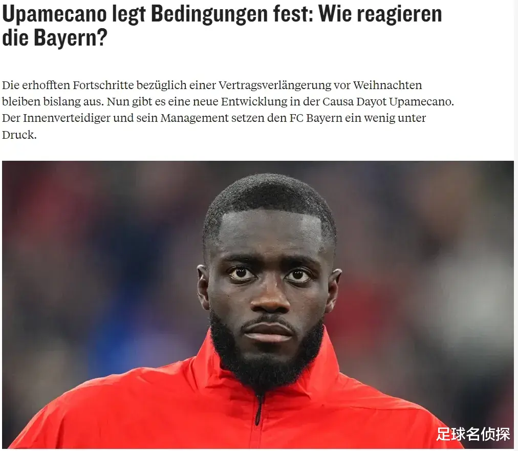 本赛季乌帕梅卡诺在孔帕尼手下发挥出色,而踢球者和体育图片报都表示法国人想要1600万欧元的年薪,并且还要加上违约金条款,不过,据悉球员方面对拜仁迟迟不愿满足他们的要求感到越发失望。