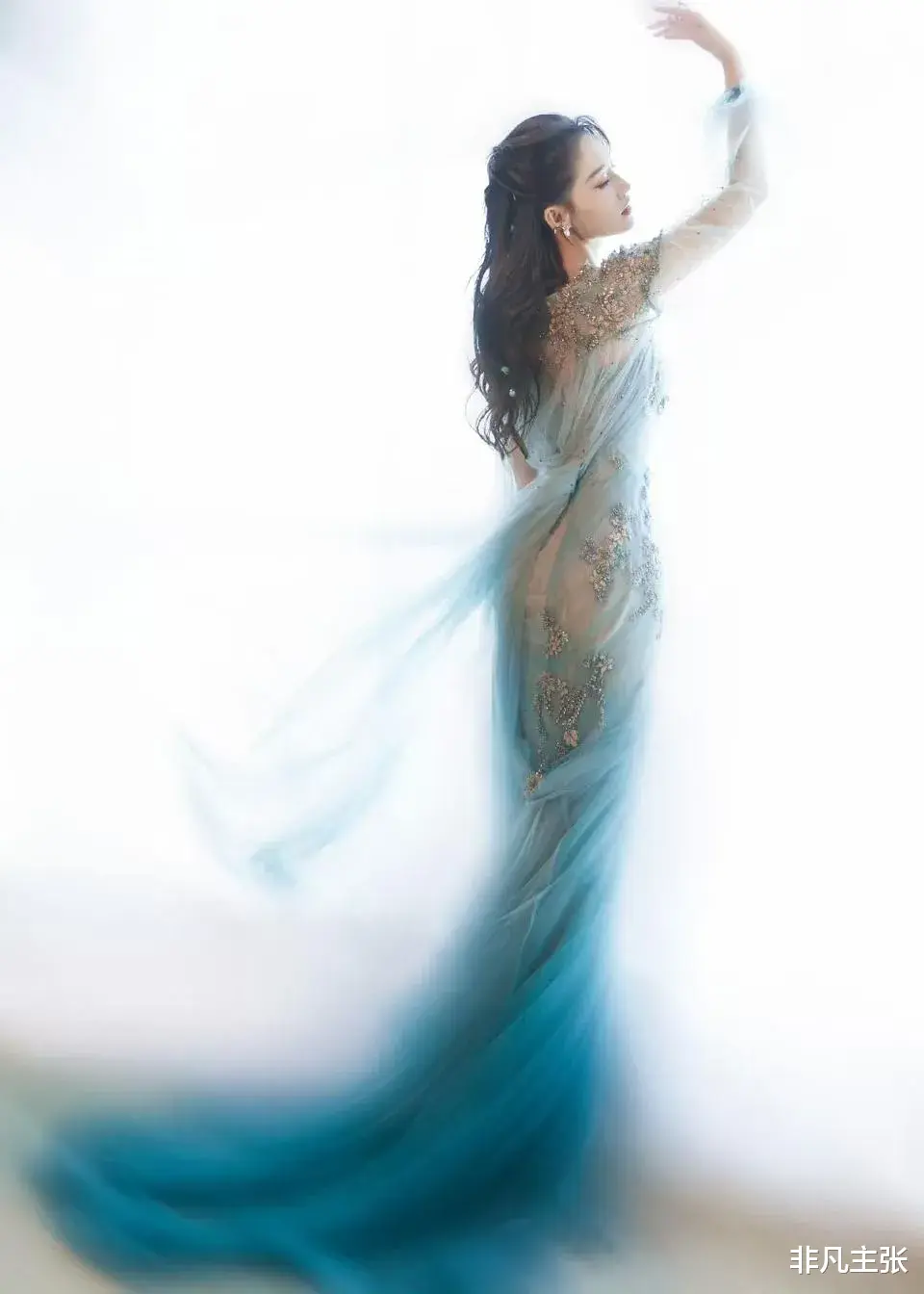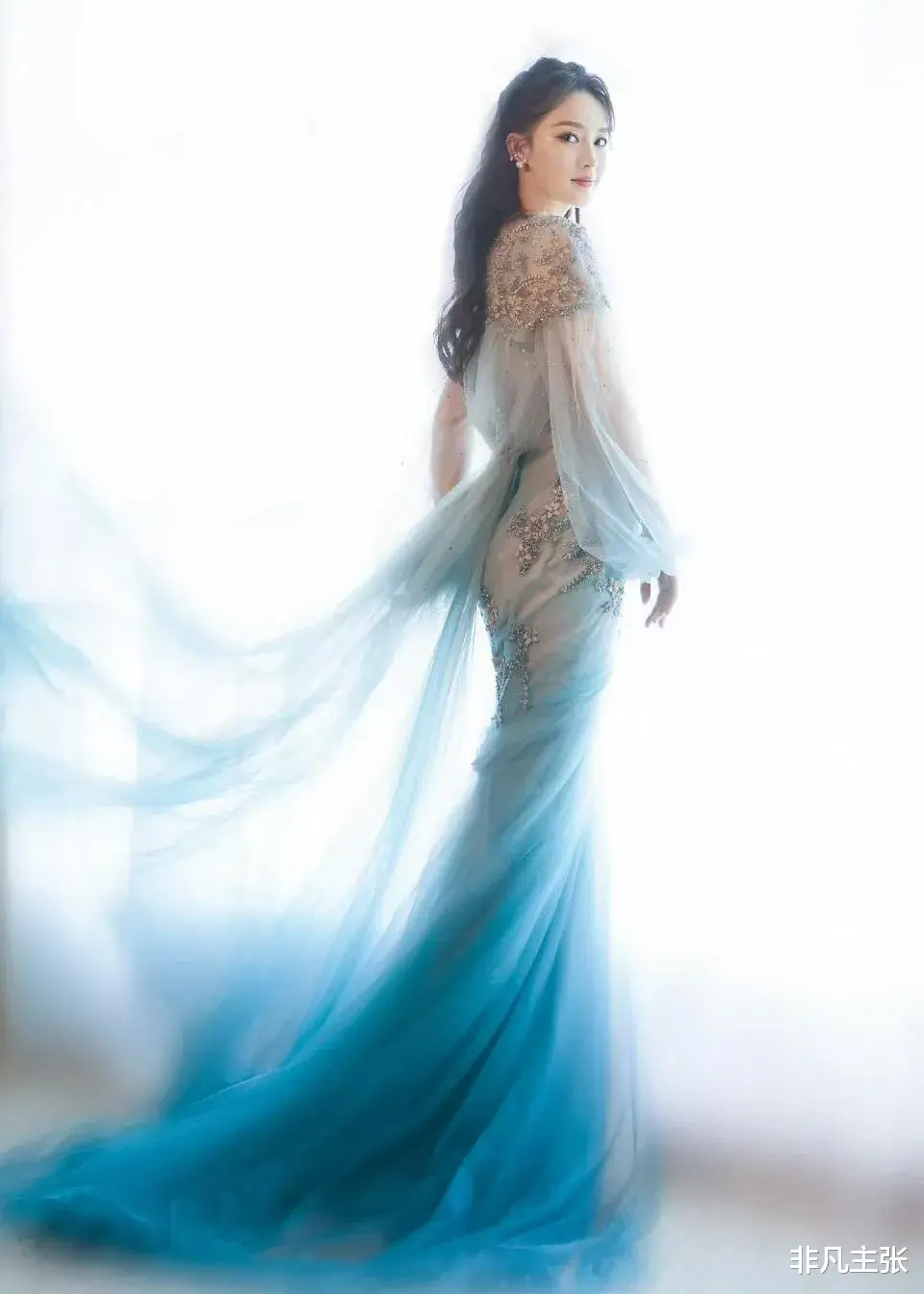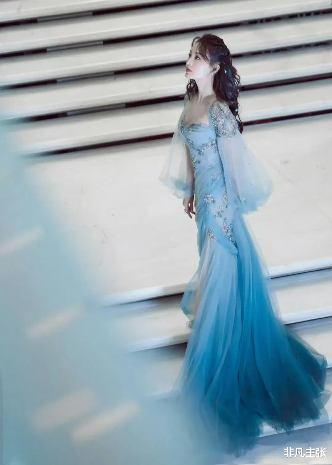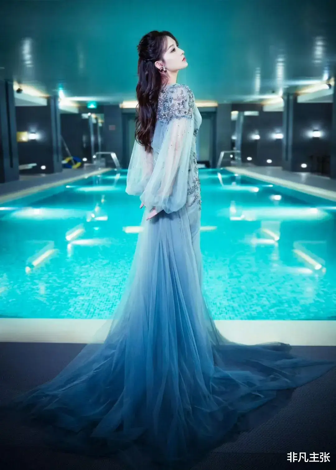 穿着一袭蓝色长裙的礼裙,清冷感满满,像极了美人鱼,美得毫不费力。柔和又独特的雾蓝色,与轻盈透视薄纱相结合,碰撞出一种清新朦胧的美感,营造出一种神秘又诱人的视觉效果,将李沁衬显得非常的典雅高贵。
