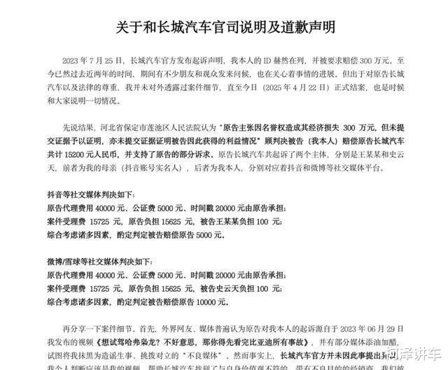 谁能想到,他也会有今天——因名誉纠纷败诉,公开向长城汽车道歉并赔偿1.52万元!
