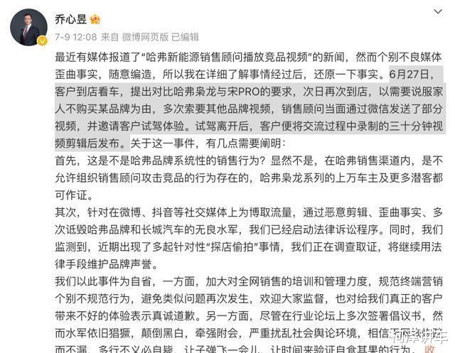 时任哈弗品牌执行副总经理乔心昱亲自下场回应,说视频是剪辑过的,而且哈弗不允许销售攻击竞品。