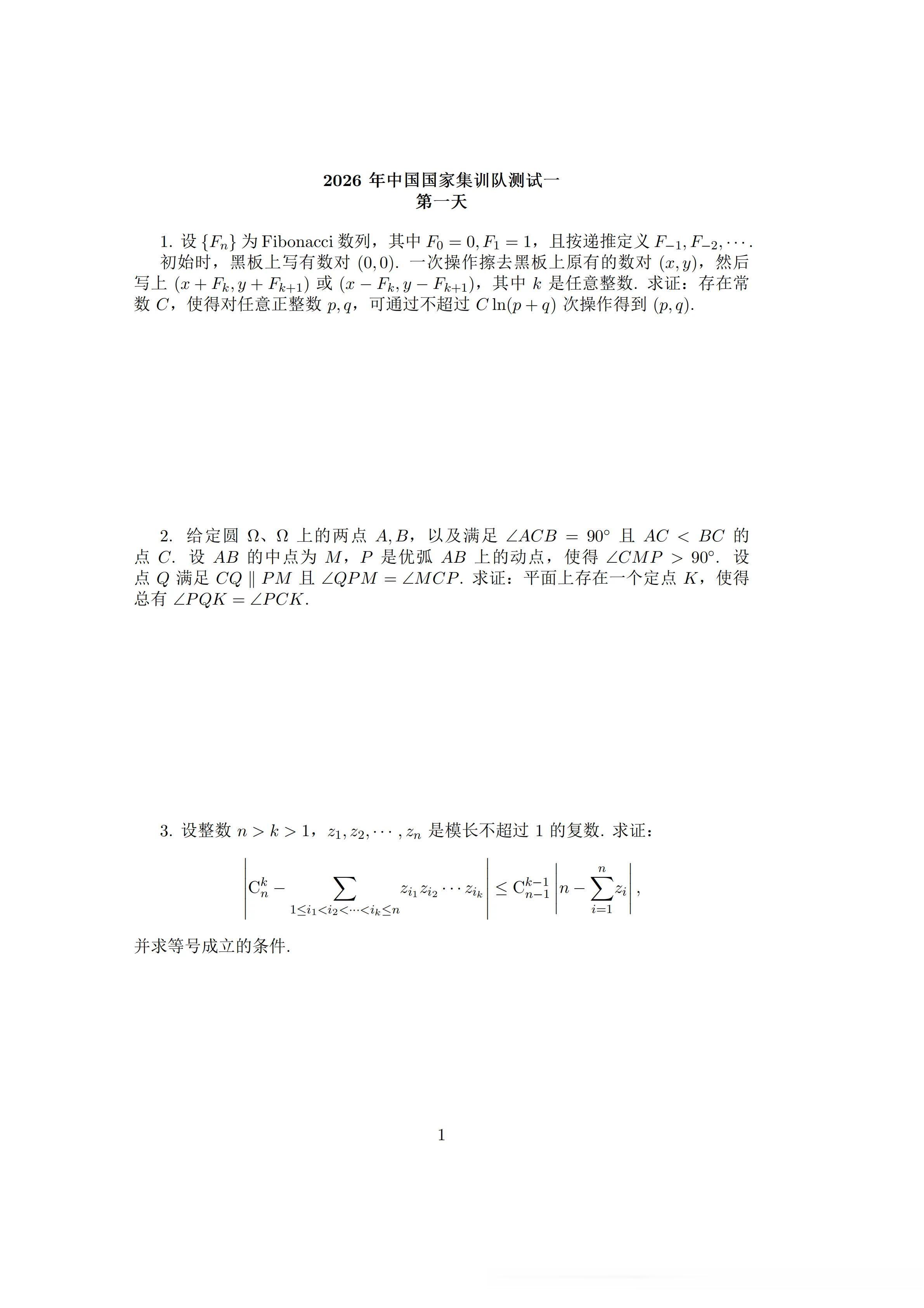 第一天试题 (Day 1)第1题:数论/组合数论 (Fibonacci数列与操作问题)题目概览:初始数对为 (0,0)(0,0) ,每次操作可以加上或减去相邻的Fibonacci数对 (Fk,Fk+1)(Fk,Fk+1) 。要求证明对于任意正整数 p,qp,q ,存在常数 CC ,使得能在 Cln(p+q)Cln(p+q) 次操作内得到 (p,q)(p,q) 。考点分析:Fibonacci数列的性质:利用Fibonacci数列的递推关系和增长特性(指数级增长)。操作的逆向思维:这是一个典型的“可达性”与“操作步数估计”问题。核心思路通常是逆向操作,即从目标 (p,q)(p,q) 出发,通过减去Fibonacci对来还原到 (0,0)(0,0) 。贪心算法与对数复杂度:证明步数与 ln(p+q)ln(p+q) 成正比,暗示了每一步操作能使数值规模指数级减小(类似于辗转相除法或二进制表示)。难度评估:中等偏上。这是一道非常漂亮的数论/组合题。关键在于发现逆向操作的贪心策略(类似于欧几里得算法),并利用Fibonacci数列的性质来控制步数。对于熟悉进制表示和数论变换的选手来说,思路相对清晰。第2题:平面几何 (圆与角度条件)题目概览:给定圆 ΩΩ 上的点 A,BA,B 和满足 ∠ACB=90∘∠ACB=90∘ 的点 CC 。 PP 是优弧 ABAB 上的动点,构造点 QQ 满足 CQ∥PMCQ∥PM 且 ∠QPM=∠MCP∠QPM=∠MCP 。证明存在定点 KK 使得 ∠PQK=∠PCK∠PQK=∠PCK 。考点分析:圆的性质:直径所对的圆周角为直角( ABAB 是直径),优弧上的角度关系。轨迹与定点问题:这是几何题中的经典难点。需要证明无论 PP 如何运动,某个角度关系恒成立,暗示点 KK 与 PP 的位置无关。角度追逐与相似/全等:利用平行线和等角条件构造辅助圆或相似三角形。反演或复数法:这种涉及动点和定点的复杂几何关系,有时用解析法(坐标系)或复数法会比较直接,但纯几何解法需要极强的洞察力。难度评估:高难度。这是一道典型的IMO压轴难度的几何题。构造条件复杂,且要求证明定点的存在性。选手需要敏锐地发现图形中的不变量,或者通过特殊位置(如 PP 在特定点时)猜出 KK 的位置,再进行一般性证明。第3题:代数/不等式 (复数与组合恒等式)题目概览:给定模长不超过1的复数 z1,…,znz1,…,zn ,证明一个涉及组合数 CnkCnk 和 zizi 乘积和的不等式,并求等号成立条件。考点分析:复数的模与三角不等式:利用 ∣zi∣≤1∣zi∣≤1 这个条件。对称多项式与初等对称和:题目中的求和项是初等对称多项式 ek(z1,…,zn)ek(z1,…,zn) 。组合恒等式与不等式放缩:需要将左边的表达式与右边的 ∣n−∑zi∣∣n−∑zi∣ 联系起来。这通常涉及到复杂的代数变形或经典的不等式(如Schur不等式、Muirhead不等式等的变体,或者利用生成函数)。等号成立条件:通常意味着所有变量相等或取边界值(模为1)。难度评估:极高难度。这道题看起来非常抽象,涉及复数、组合数和不等式三个领域的深度结合。它不像一道常规的不等式题,更像是一个代数结构的深刻性质。对于大多数选手来说,找到正确的放缩方向或代数恒等式是极大的挑战。这通常是第一天的压轴题。第二天试题 (Day 2)第4题:组合/图论 (网格图与标号不等式)题目概览:在一个 2026×2026×20262026×2026×2026 的三维网格图上,顶点标号和为0。 g(e)g(e) 是边两端点标号差的绝对值。证明一个关于 ∣f(v)∣p∣f(v)∣p 和 g(e)pg(e)p 的不等式。考点分析:图上的函数与差分:这是图论中关于函数梯度(差分)和函数值的不等式。Poincaré不等式或Sobolev不等式的离散形式:这种形式的不等式在图论和分析中很常见,本质上是控制函数值的大小通过其变化率。不等式放缩与组合计数:需要利用网格图的结构(每个点有6个邻居),通过路径或覆盖等技巧进行放缩。常数 6677p6677p :这个常数看起来很随意,但实际上可能与网格的直径或某种特定的路径长度有关。难度评估:中等。虽然看起来很吓人,但这类“图上函数不等式”是组合数学中的一个经典主题。只要理解了其背后的“差分控制函数值”的思想,通过构造路径或利用图的连通性,证明思路是比较明确的。常数估计可能繁琐,但核心思想不难。第5题:组合/图论 (完全图的边标号与路径和)题目概览:给 K2026K2026 的边标号 11 到 C20262C20262 ,每个数用一次。要求任意两点间存在一条路径,其边标号和不超过 kk 。求最小的 kk 。考点分析:极值图论与标号问题:这是一个典型的极值组合问题。路径和的最小化:目标是让图中任意两点间的“最短路径”(按标号和算)尽可能小。构造与下界估计:需要构造一个标号方案使得 kk 尽可能小(上界),并证明任何方案下 kk 都不能更小(下界)。贪心或分治策略:构造时可能需要将小标号集中在某些区域,或者采用某种分层结构。难度评估:高难度。这类问题需要很强的构造能力和对图结构的深刻理解。下界估计通常比较棘手,可能需要考虑所有路径的平均值或利用某种计数论证。这是第二天的一道硬骨头。第6题:数论/数列 (质数与数列出现次数)题目概览:定义一个数列 anan , a1=2a1=2 , anan 是不整除某个乘积的最小质数。 f(p)f(p) 是质数 pp 在数列中出现的次数。证明一个关于 f(pi)f(pi) 和质数 pipi 的不等式。考点分析:数列的递推定义:理解 anan 的定义是关键。这是一个“反素数”或“避免整除”的构造。质数分布与数论函数:涉及质数在特定数列中的分布密度。不等式证明:右边的表达式 12(maxpi+∑pi)21(maxpi+∑pi) 暗示了某种线性或次线性增长。归纳法或反证法:可能需要通过归纳来控制 f(p)f(p) 的大小。难度评估:中等偏上。这