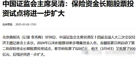 重磅三:证监会力推中长期资金入市,保险资金投资试点扩大!3月6日,证监会主席吴清再次发声,强调中长期资金是资本市场健康运行的“稳定器”和“压舱石”。