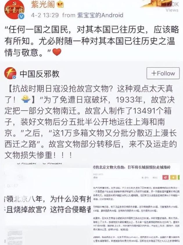 4月6日,再抛“日军占领北京八年为何没抢故宫文物?”并附争议文章,被批“替侵略者洗白”。