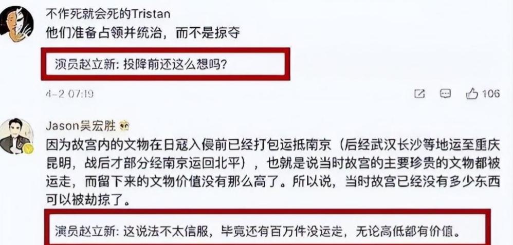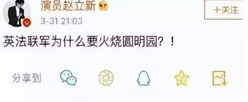 2019年,赵立新微博发问:“英法联军为何火烧圆明园?”网友科普后,他竟调侃:“紫禁城是忘了烧还是没带打火石?”