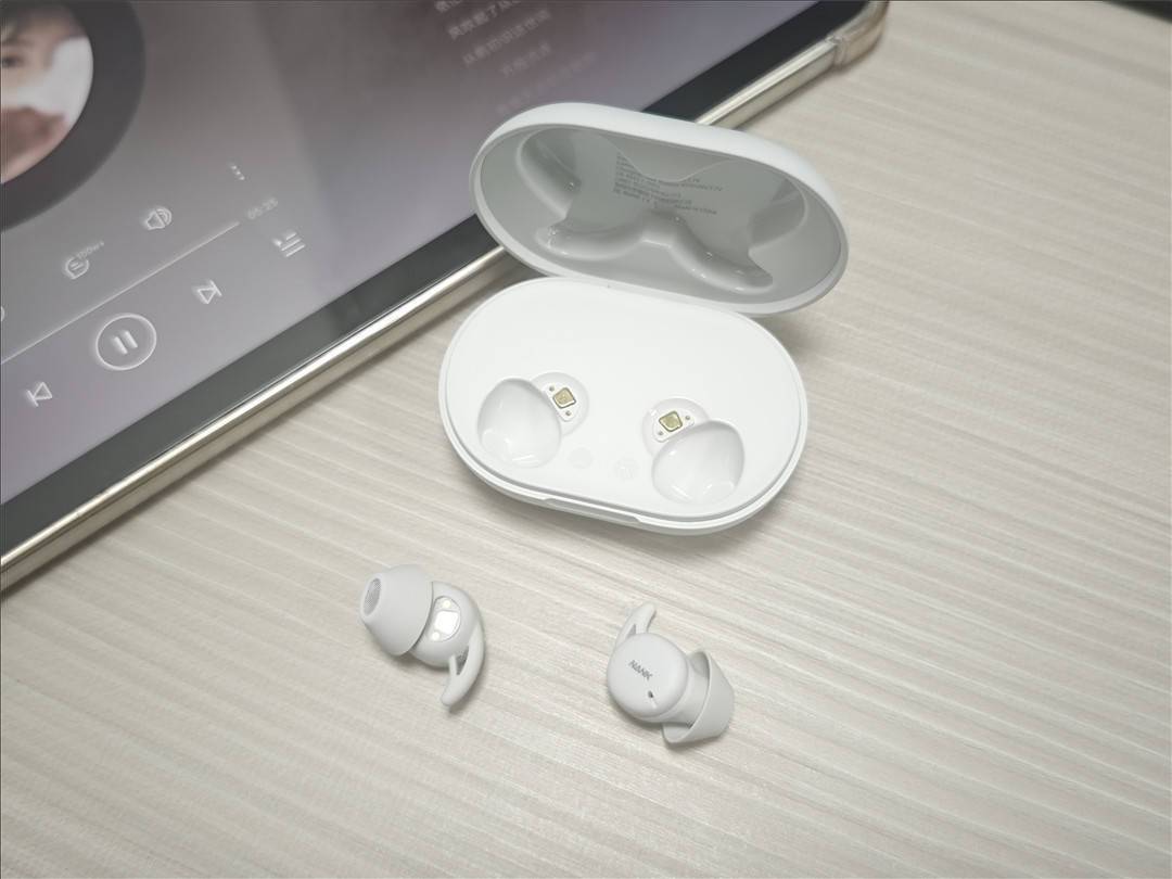 南卡DeepSleep在佩戴体验上有着极为亮眼的优势,单耳重量轻至约3克,内置声学模组厚度也仅4mm左右,整体轻薄度远超普通耳机。机身采用亲肤柔软的NanoSoft材质,搭配ZPP三点分压结构,能够均匀分散佩戴压力,不管是侧卧、俯卧还是夜间翻身,耳机都能紧密贴合耳廓曲线,全程零感零压,佩戴舒适又稳固,佩戴存在感极低。就算是整夜连续佩戴,也几乎感觉不到耳机的存在,耳部压力小、透气性好,不容易产生疲劳感和压痕,真正带来舒适无负担、安心睡到天亮的沉浸式睡眠体验。