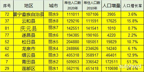 我们再看丽水,丽水也没有人口增长率为负的县区,青口县增长率最高达到51%,而庆元县和遂昌县只有0.7%和2.2%。
