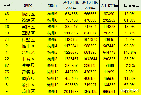 人口增量最多的县区在杭州,杭州萧山区人口增量66万多,余杭区增量达到64万多,临平区达到58万多,而西湖区、钱塘区和上城区人口增量都达到29万。