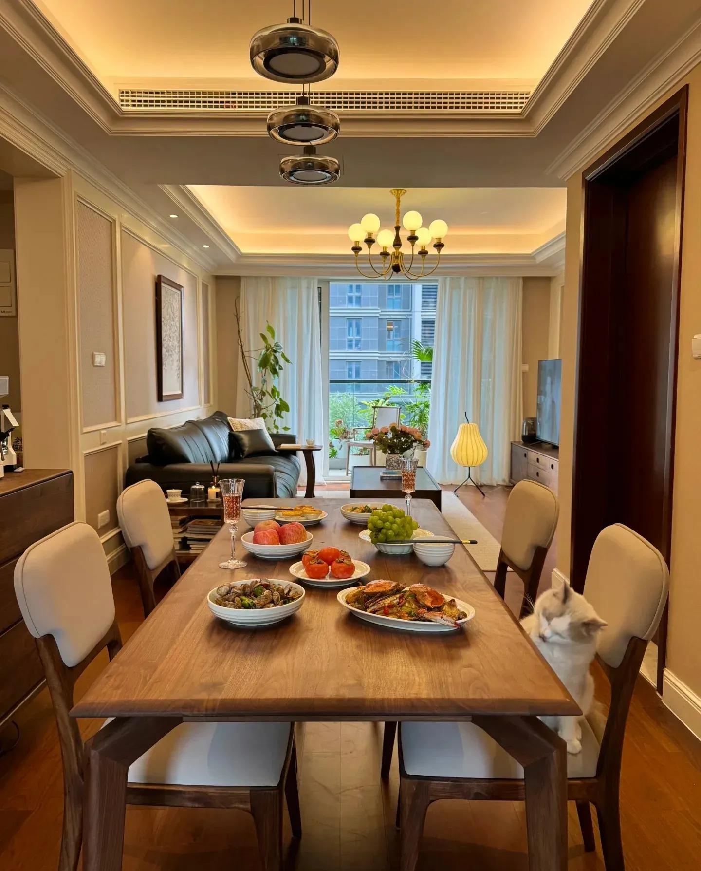 餐厅区域选择长方形木质餐桌,真心质感很可以。上方搭配吊灯。