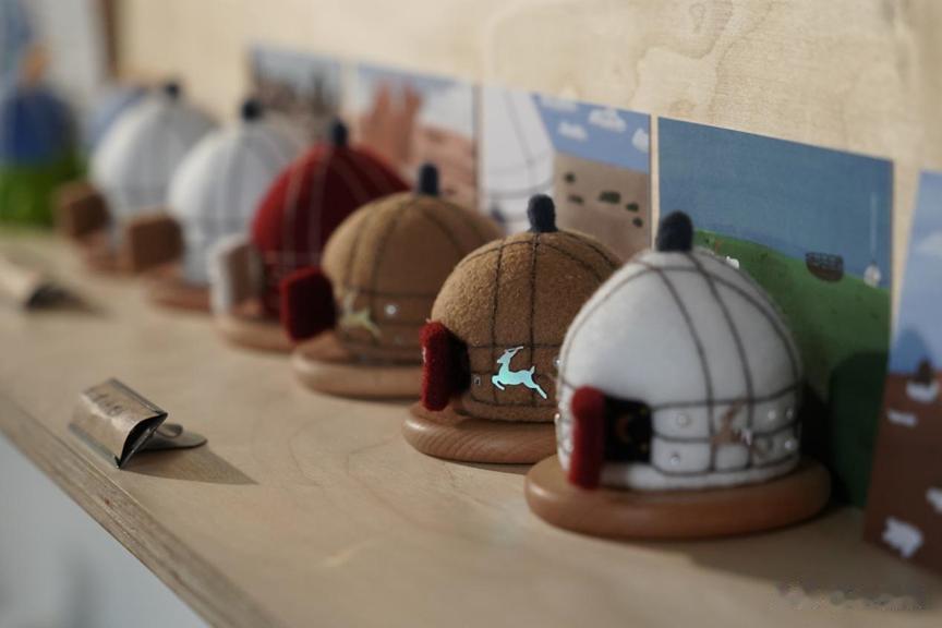 那时莲花可以一个月不社交,她像待在一个洞里忘了时间,“等反应过来,作品已经做好了,还会疑惑这是我做出来的吗。”这些作品后来基本成了工作室的畅销款,如“草原四季”挂件,不同季节的天空与草原戳在“甜甜圈”上,圆环中心卧着小羊羔和蒙古包;“巴尔虎小怪兽”则是将蒙古包做成小精灵,它肚子里装满星空,正大张着嘴,想啃食掉人的烦恼。