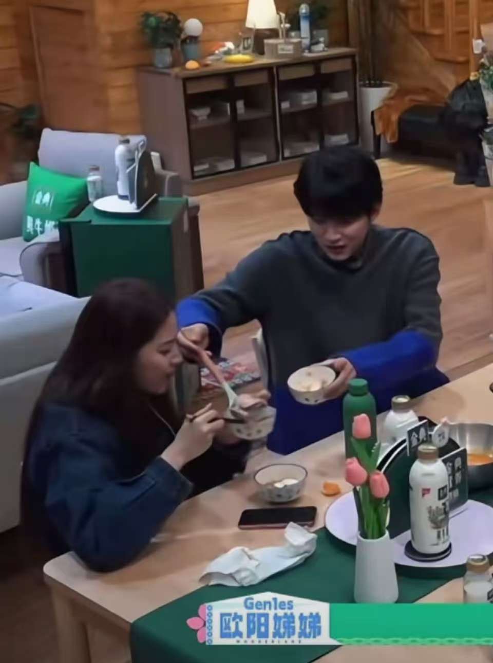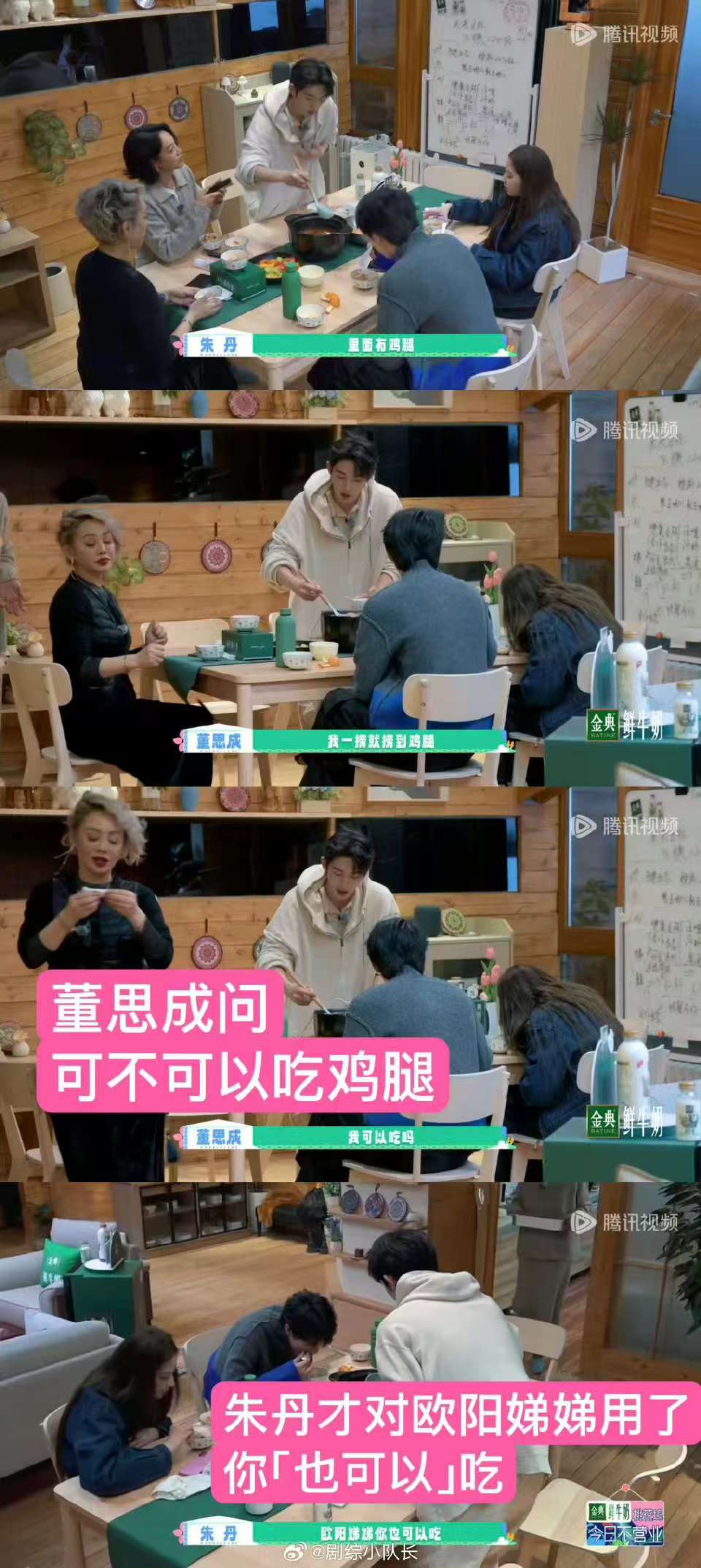 被朱丹强行分配了鸡腿的周栩然察觉到不对劲,把鸡腿给了一旁的妹妹欧阳娣娣。