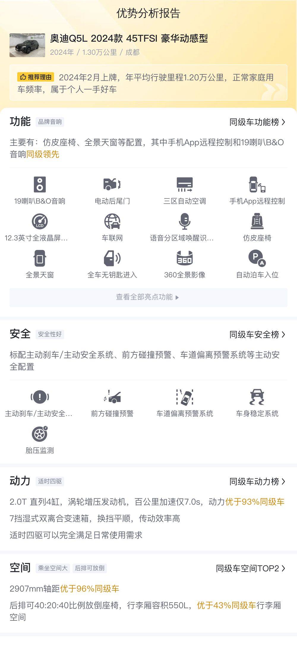 在用车成本方面,根据估算,这辆奥迪Q5L的年均综合用车成本大概在每年1.5万元左右。但这项支出会根据车主的具体使用情况和用车环境等因素有所变动。