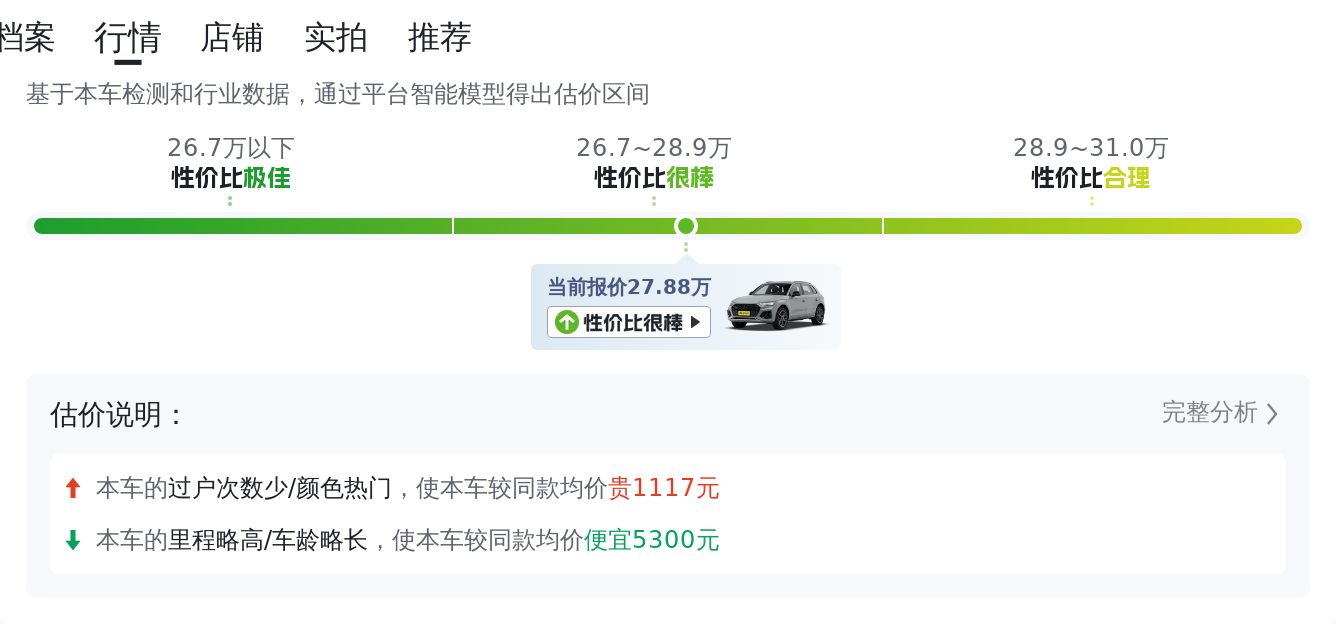 市场行情也是决定这款车价值的重要因素。根据当前市场情况,这辆奥迪Q5L的售价在23.16万至27.65万之间。但需注意,市场行情价与最终成交价存在差异,车辆的最终售价受多种因素共同作用,包括车龄、里程、车况和所在地等。