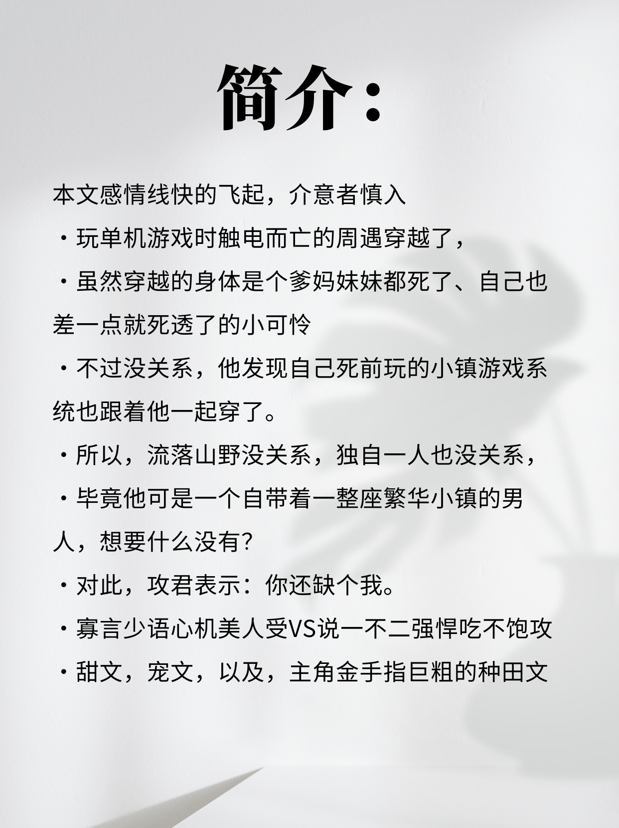 短评:本文是一本穿越线的种田文,男主因玩游戏触电穿越,别人都是穿越变成人生赢家,他穿越变成一个无父无母无亲人的小可怜。然而上天关上一扇门,就会再开一道窗,游戏里的系统也跟着一起穿越。