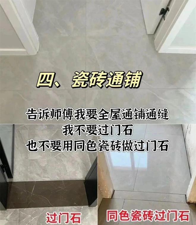 如今大部分装修都是做通铺,故而在一开始排版的时候,这点也要和贴砖的师傅说清楚——既不要留过门石,也别画蛇添足,用同色瓷砖切出过门石的样子。