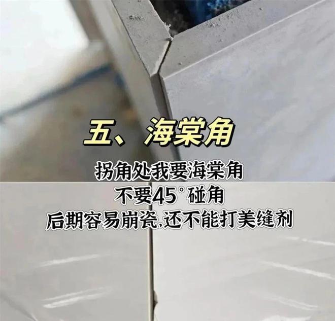 海棠角一般是买瓷砖的时候,可以让瓷砖厂家用机器切出来,略微贵一点,但规整很多,千万别信瓦工说的可以手工切45°角,美缝做完一样这种话,否则你大概率会和我家一样,收获一个满是崩瓷的边角,最后无奈返工更浪费。