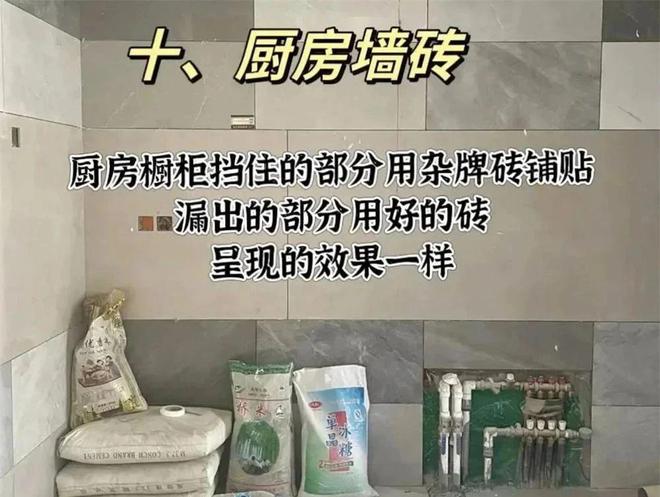 厨房做橱柜的位置,吊柜、底柜墙砖其实可以用杂牌砖或者边角料,这是个节省成本的小细节,毕竟以后装上柜子以后十年八年也看不见,如果不是“强迫症”的话,可以让瓦工直接贴杂砖。