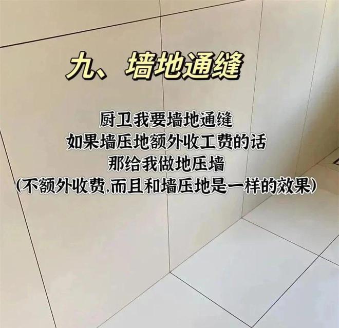 厨卫的墙砖和地砖做通缝也是为了视觉上的好看,其实墙压地和地压墙现在并没有太大区别,想要不渗水主要还是看防水和美缝,这里就注意别被瓦工师傅狮子大开口增项就行了。