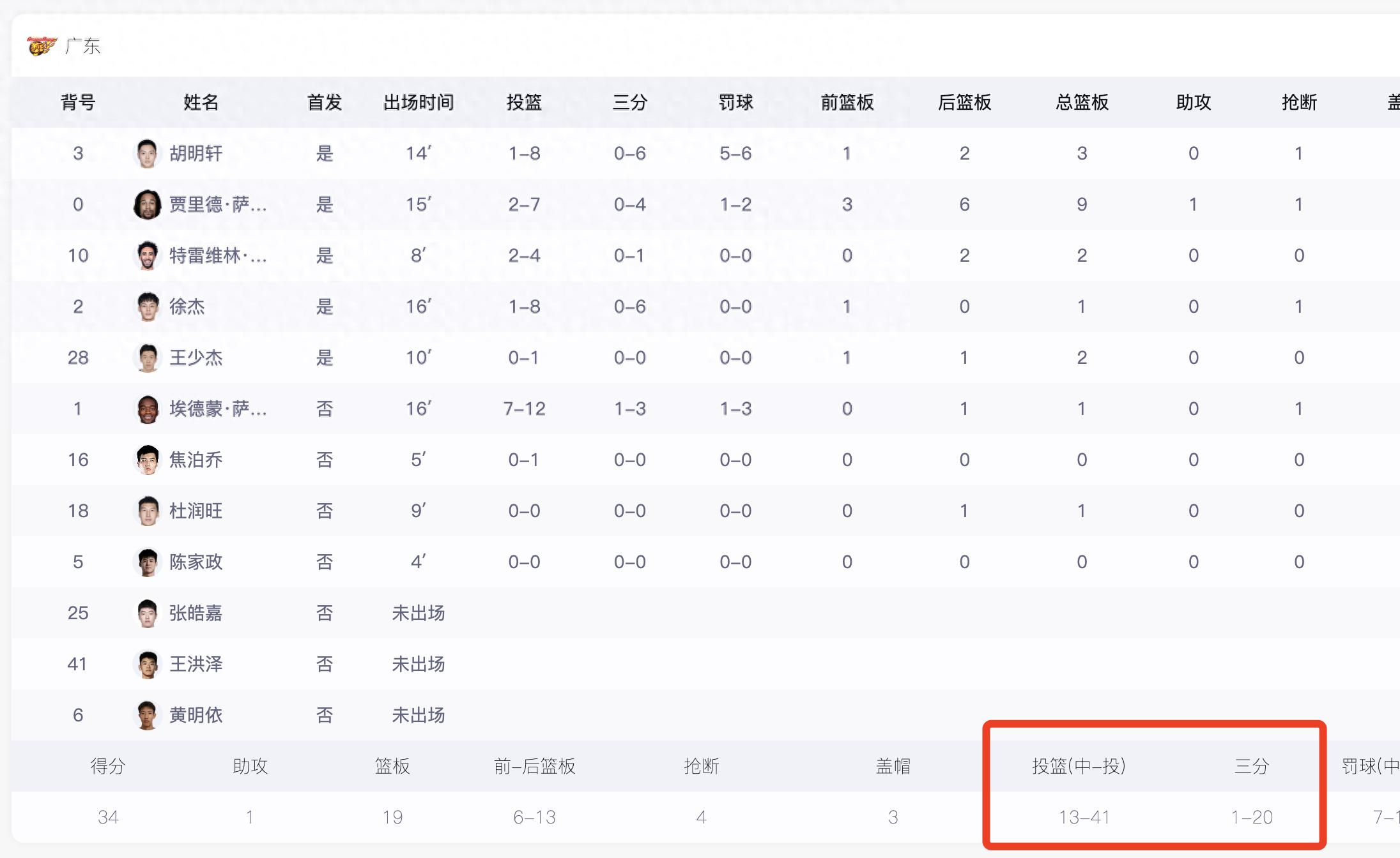 本场比赛广东的4大国手表现拉胯,徐杰和胡明轩的投篮只有8中1,杜润旺和焦泊乔上半场比赛都得到了0分,34分里面一大半都是外援萨姆纳得到的,国内的球员实在太拉胯了。目前广东队的阵容急需要2人赶紧复出啊,他们就是崔永熙和麦考尔了,今晚他们两人也在场边看比赛,不知道作何感想。