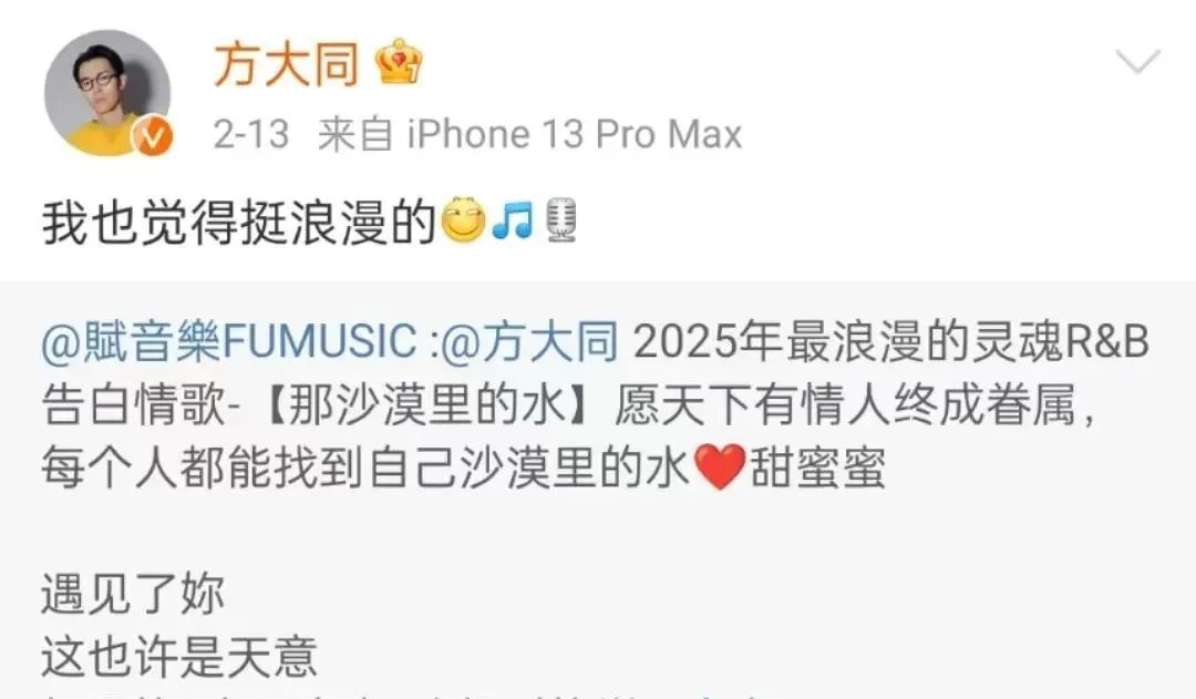 方大同最后一条微博定格在2月13日,情人节的前一天。