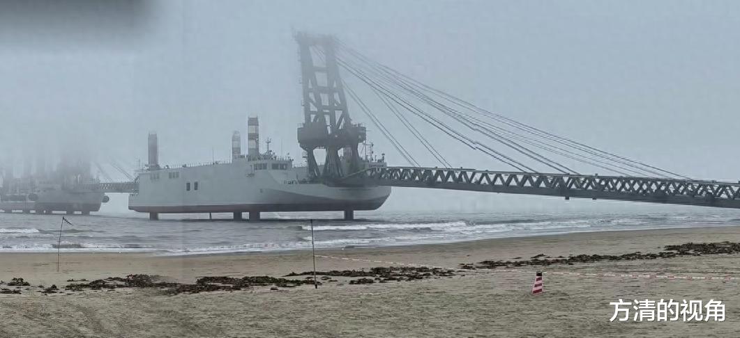 画面中的特种登陆驳船采用了极其罕见的浅吃水+自升柱的船体设计,还配备了自带斜拉栈桥,这样一来,特种登陆驳船就能和大吨位的军民两用滚装船实施对接,还能越过软质沙滩,将登陆部队直接送上硬质道路,避免了登陆部队耗费大量时间和精力于滩头阵地,在分秒必争的登陆与反登陆阶段,技术能力带来的战斗力进步相当可观,这是国家工业能力的直接体现,只要前线需要,我就能造任何装备。