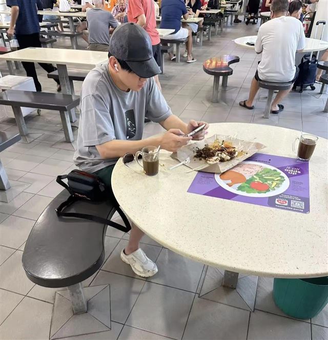 他熟练地在咖啡摊前扫码支付,夹着餐盘在鱼丸面和肉骨茶档口之间穿梭。