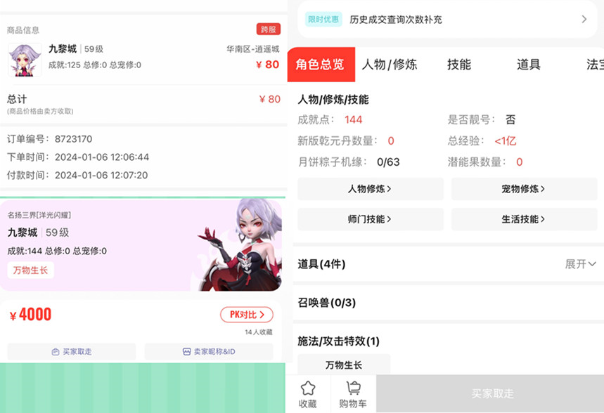 上面这位玩家在半年前以80的价格买了一个59级的九黎城,不过这位玩家买了这个59级的九黎城以后并没有进行太多的操作。然后现在出售的价格就变成了4000多,上面这位玩家的这个角色的价格之所以涨得这么快,就是因为这位玩家用系统赠送的那2000点免费的仙玉进行七夕情缘晶币抽奖的时候抽出来了一个万物生长。然后才被别人买走的,但是买走这个角色的玩家应该会很难受,因为九黎城在正常的情况下是不会触发万物生长的施法特效的,他需要带一个套装。