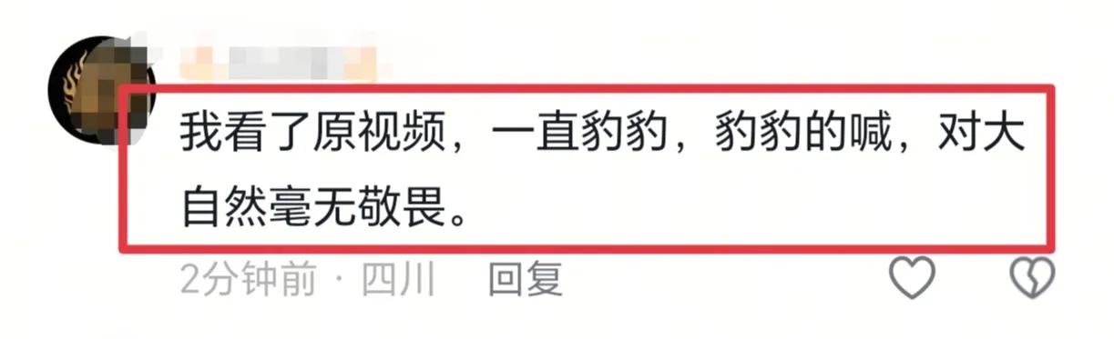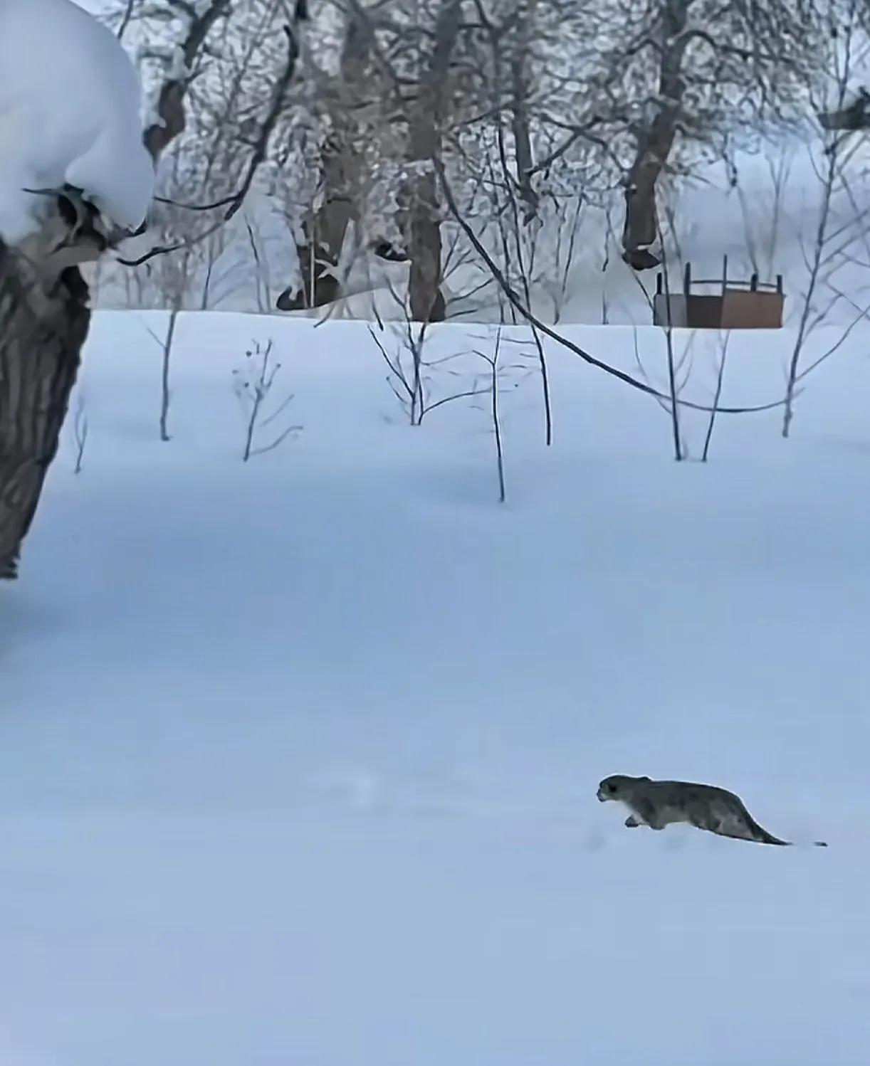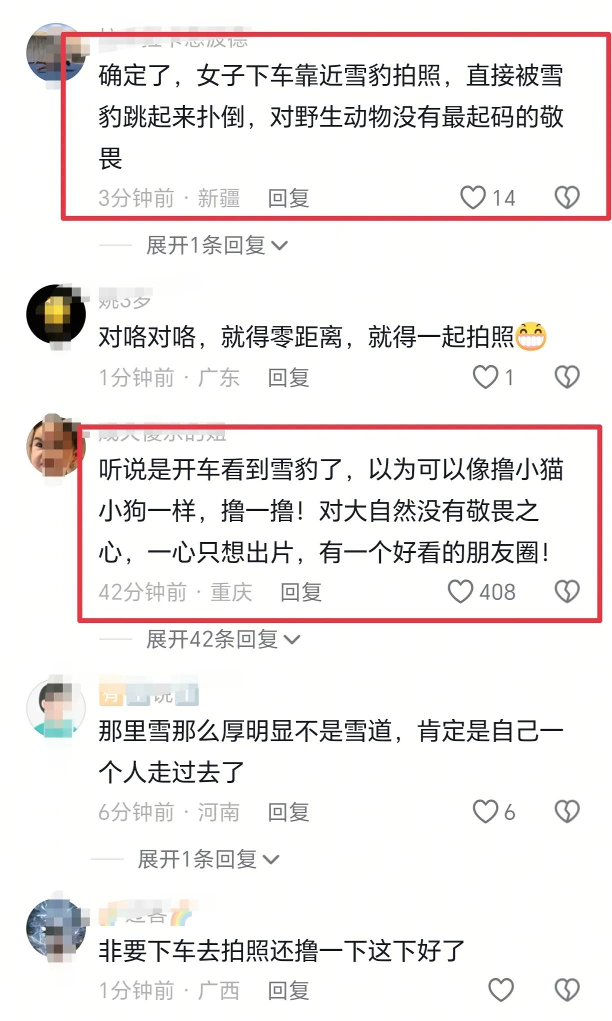 看到雪豹,她第一反应不是赶紧离开,而是嘴里一直喊着“豹豹、豹豹”还以为是自家的小猫,想去拍照还想摸它。