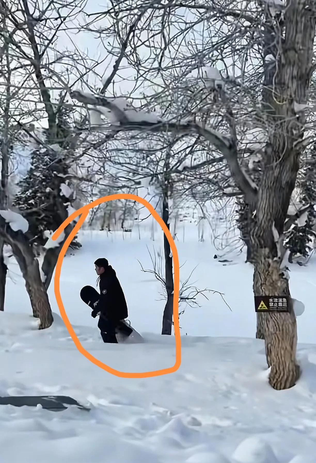 远处可以看到一只身材娇小的雪豹正在雪地里淡定地行走着,然而这时候居然还有一位小伙子拿着滑板,试图近距离观察一下雪豹。