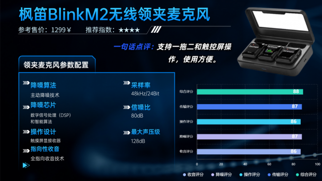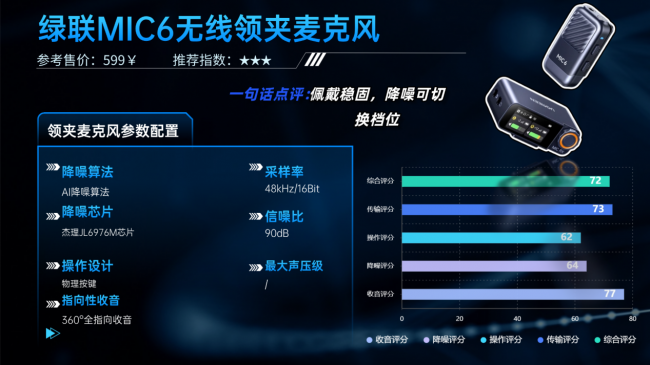 收音持久:支持48kHz/24Bit高清采样,信噪比>80dB,搭载全向高灵敏咪头,基础风噪抑制效果较好,2.4G数字传输稳定,单发射器续航6小时,支持Type-C快充和边充边用,补电便捷。