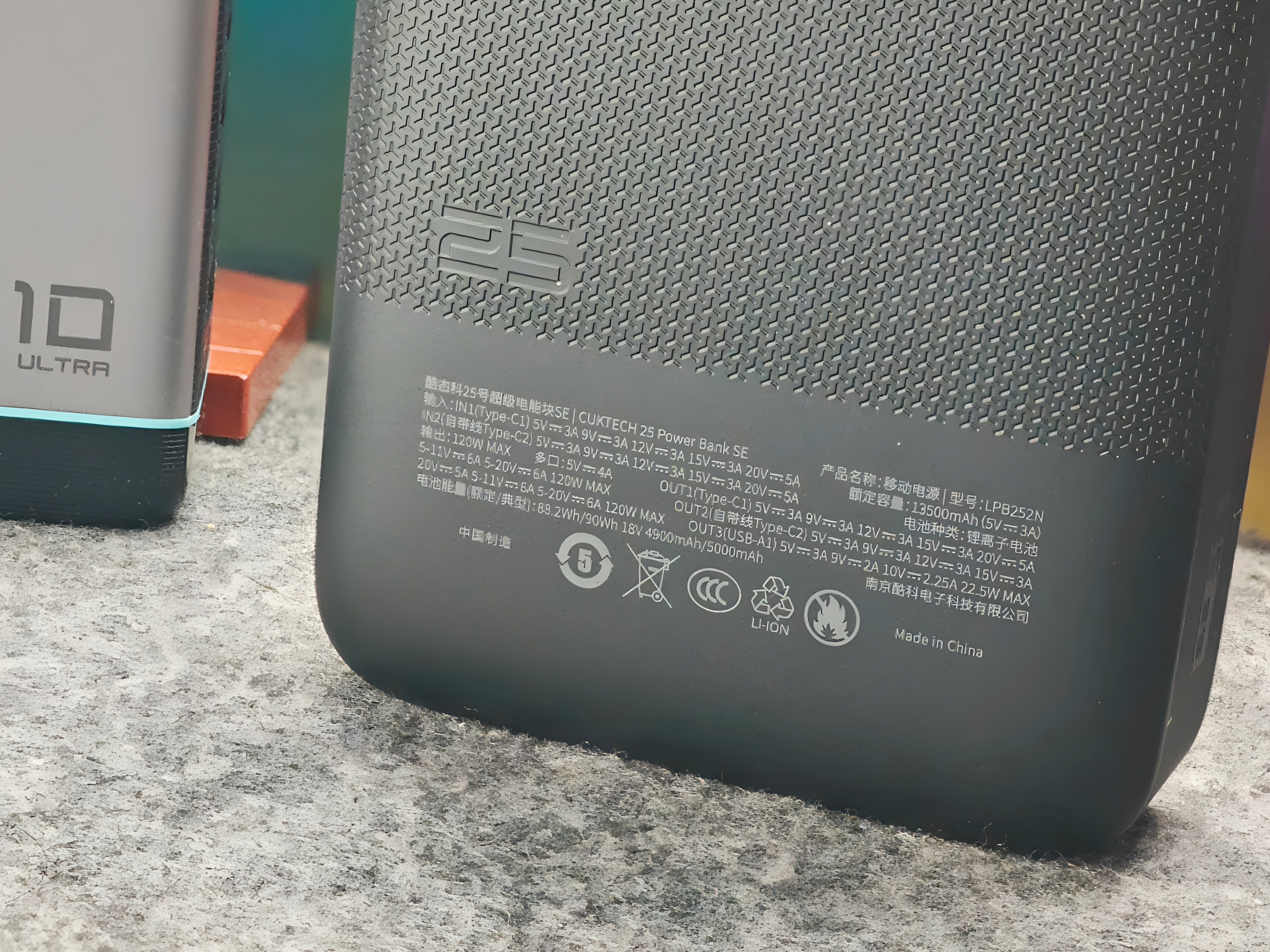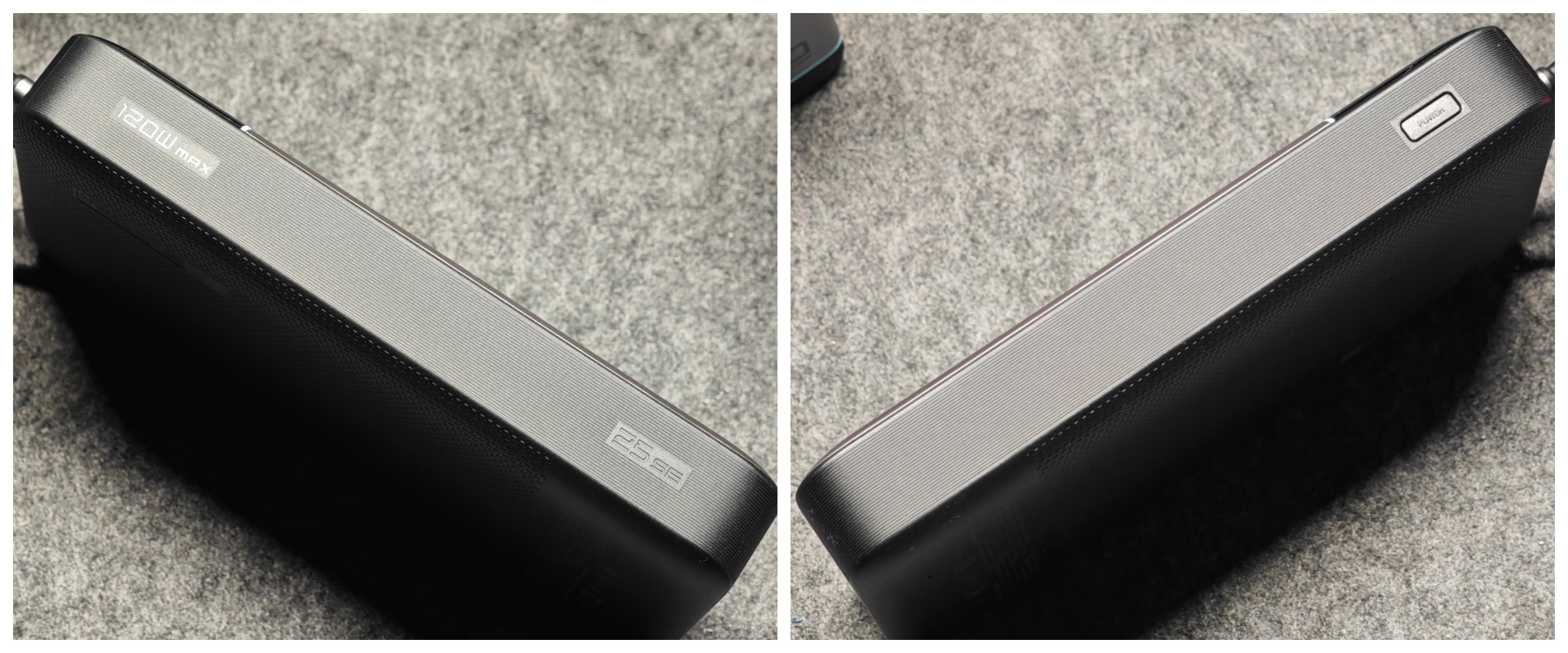 ▲侧面也设计了横向防滑纹理,并有120W功率标识以及数字25的型号标识,另一个侧面则是电源开关键,可以实现 电量显示/功率显示切换 、低电量模式开关 等功能。
