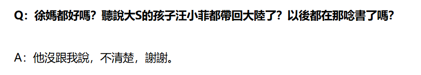 大S妈妈仅回应“律师处理中,我没体力了解,谢谢不要再问了。”